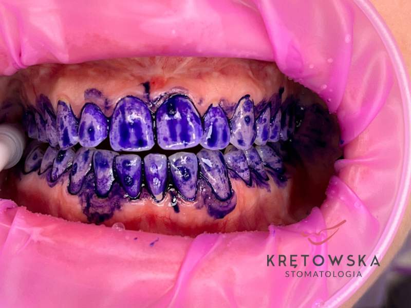 • wybarwienie biofilmu na zębach, który jest główną przyczyną chorób jamy ustnej i tworzenia się kamienia. Dzięki wybarwieniu specjalną gąbeczką pacjent przekona się, które obszary jamy ustnej nie są odpowiednio czyszczone.