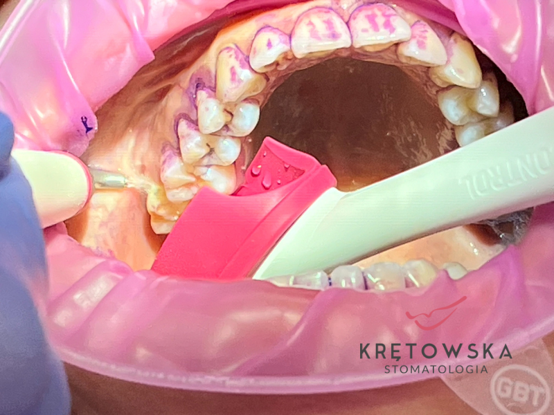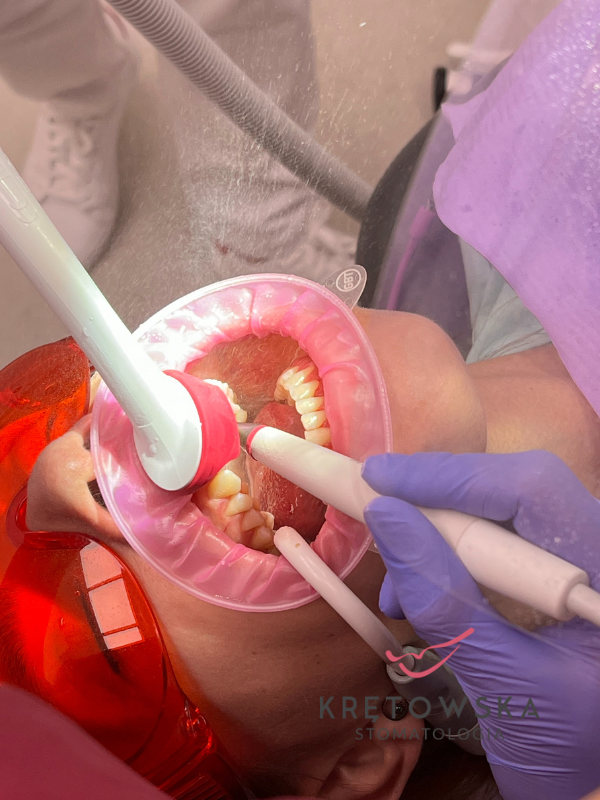 • ukierunkowane usunięcie kamienia, które jest mniej inwazyjne i przyjemniejsze dla pacjenta. Oczyszczanie jest przeprowadzane naddziąsłowo i poddziąsłowo, czyszczone są kieszonki zębowe.